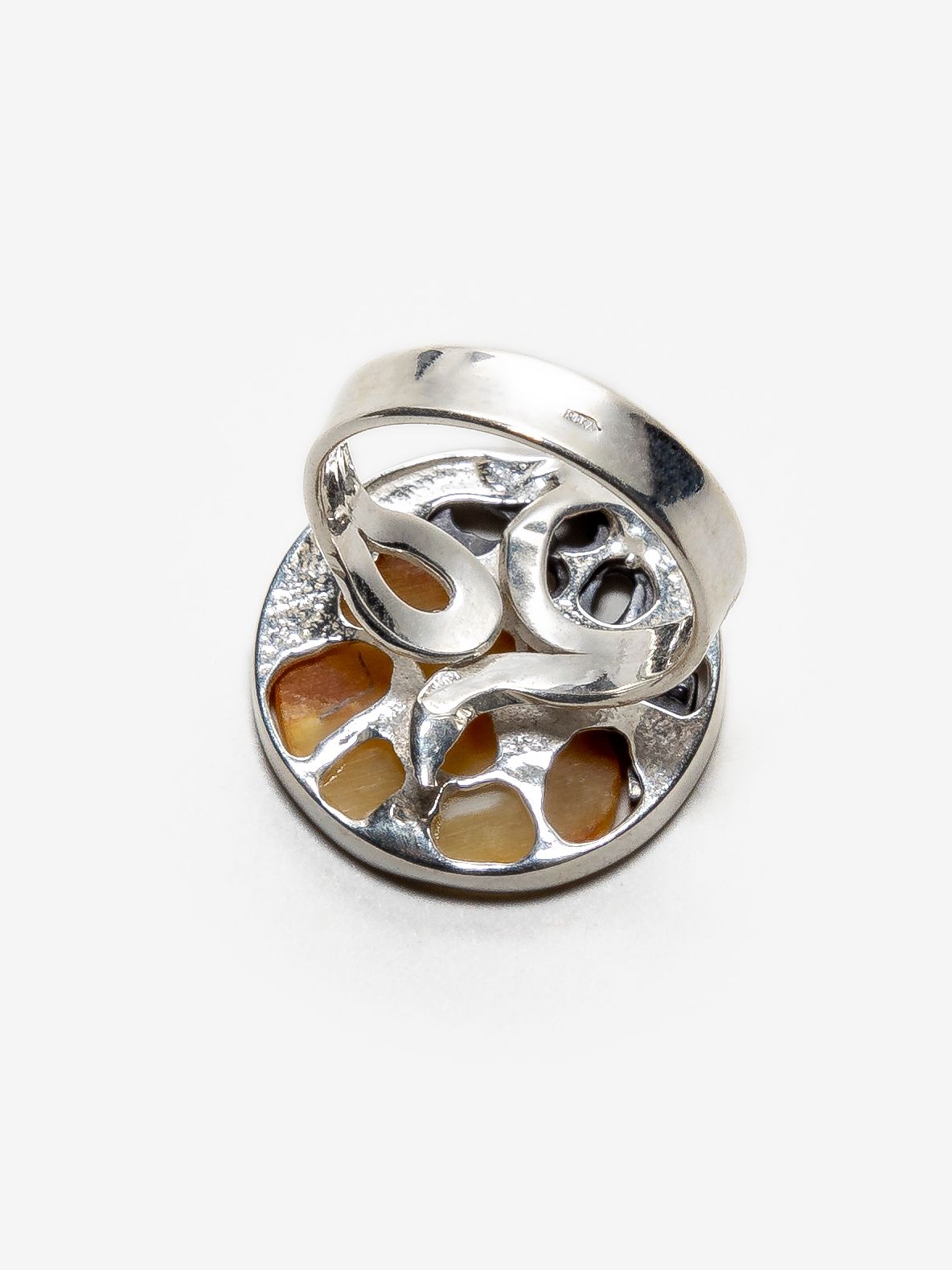 Кольцо безразмерное круглой формы созданы вручную и украшены цельными кусочками янтаря с уникальной природной текстурой.