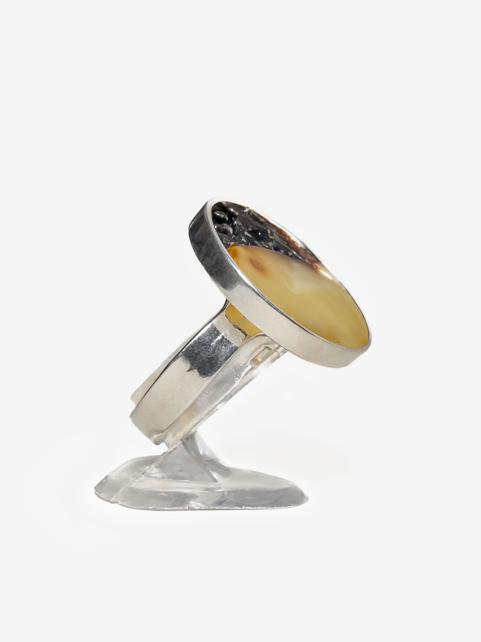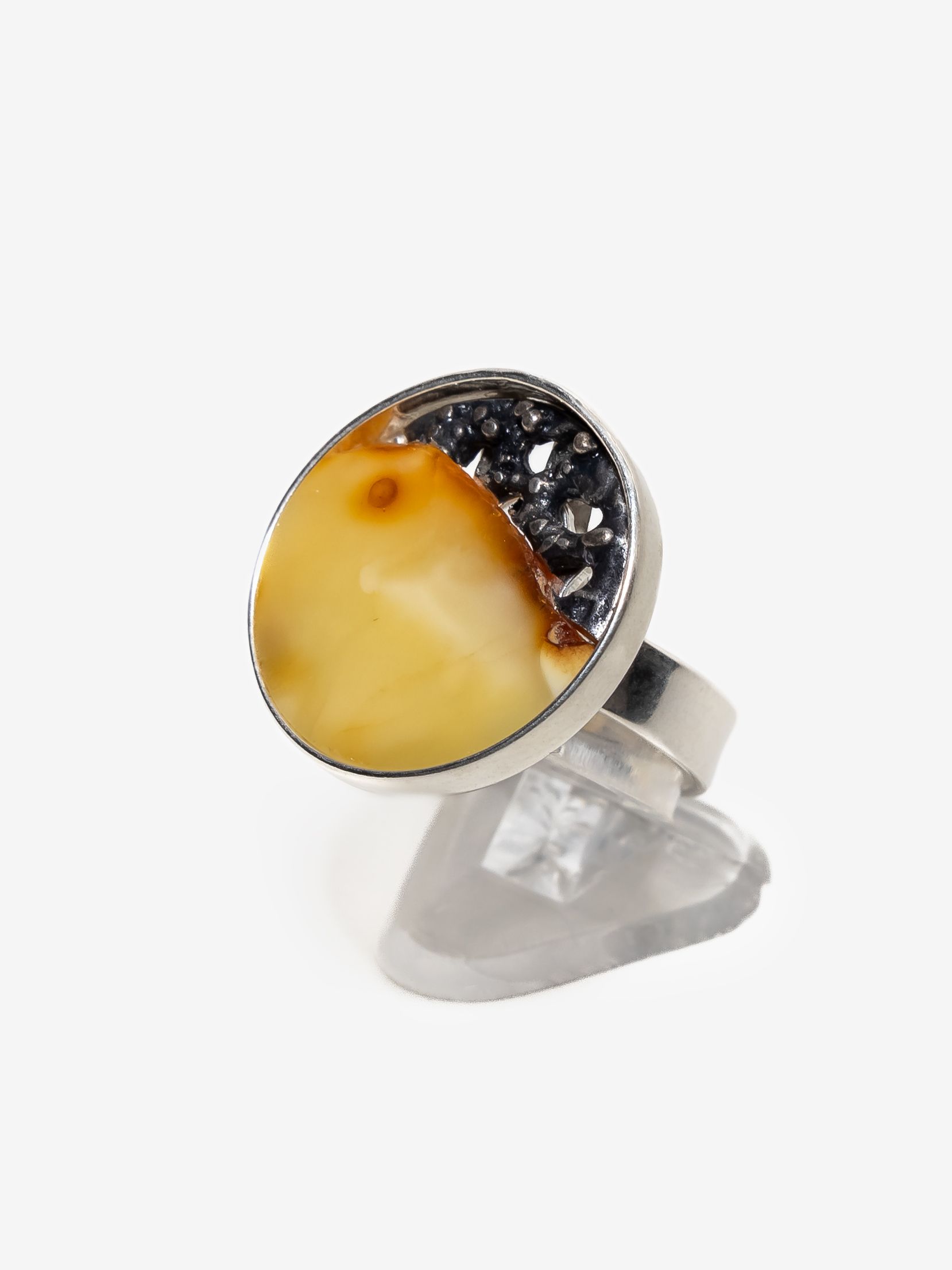 Кольцо безразмерное круглой формы созданы вручную и украшены цельными кусочками янтаря с уникальной природной текстурой.